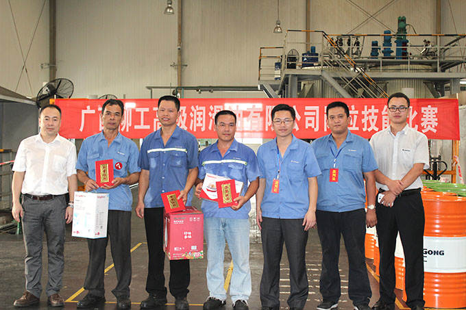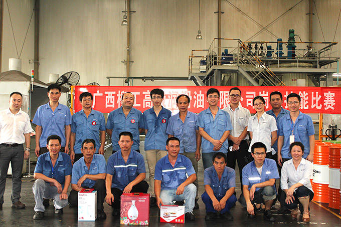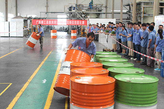 ? ? ? ? 2014年6月26日,廣西柳工高級潤滑油有限公司崗位技能比賽在調(diào)合廠正式拉開序幕。隨著裁判清脆的一聲哨響,200L油桶轉(zhuǎn)移比賽正式開始。“加油,加油!”的助威聲在調(diào)合廠車間此起彼伏,經(jīng)過緊張激烈的角逐,譚定羽獲得第一名,謝永華、李占擴(kuò)分別獲得第二、三名。