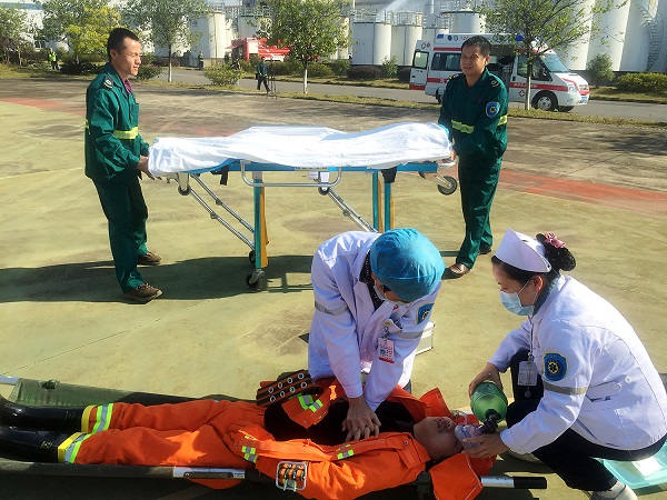? ? ? ? 演練現(xiàn)場設(shè)置在司能石油化工有限公司D401原材料儲罐外,演練科目設(shè)置為員工在對儲罐進(jìn)行補(bǔ)焊作業(yè)時突發(fā)火災(zāi),火災(zāi)現(xiàn)場臨近柴油儲罐,兩名微型消防人員進(jìn)行自救時受傷、昏迷被困現(xiàn)場。演練按先期應(yīng)急處置,企業(yè)自救和緊急疏散,消防大隊(duì)和120急救中心人員現(xiàn)場一起出動應(yīng)急救援,污染排查,總結(jié)等五個環(huán)節(jié)進(jìn)行。整個演練過程環(huán)環(huán)相扣,有條不紊,各應(yīng)急隊(duì)伍、救援隊(duì)伍緊密配合,協(xié)同作戰(zhàn),最終成功控制了事故損失的進(jìn)一步擴(kuò)大,消除了事故的危害,獲得了圓滿成功。演練歷時約1小時30分,共有95人參加演練,出動消防車6輛,120急救車1輛,以及安監(jiān)、交警、環(huán)保等應(yīng)急救援車輛3部。